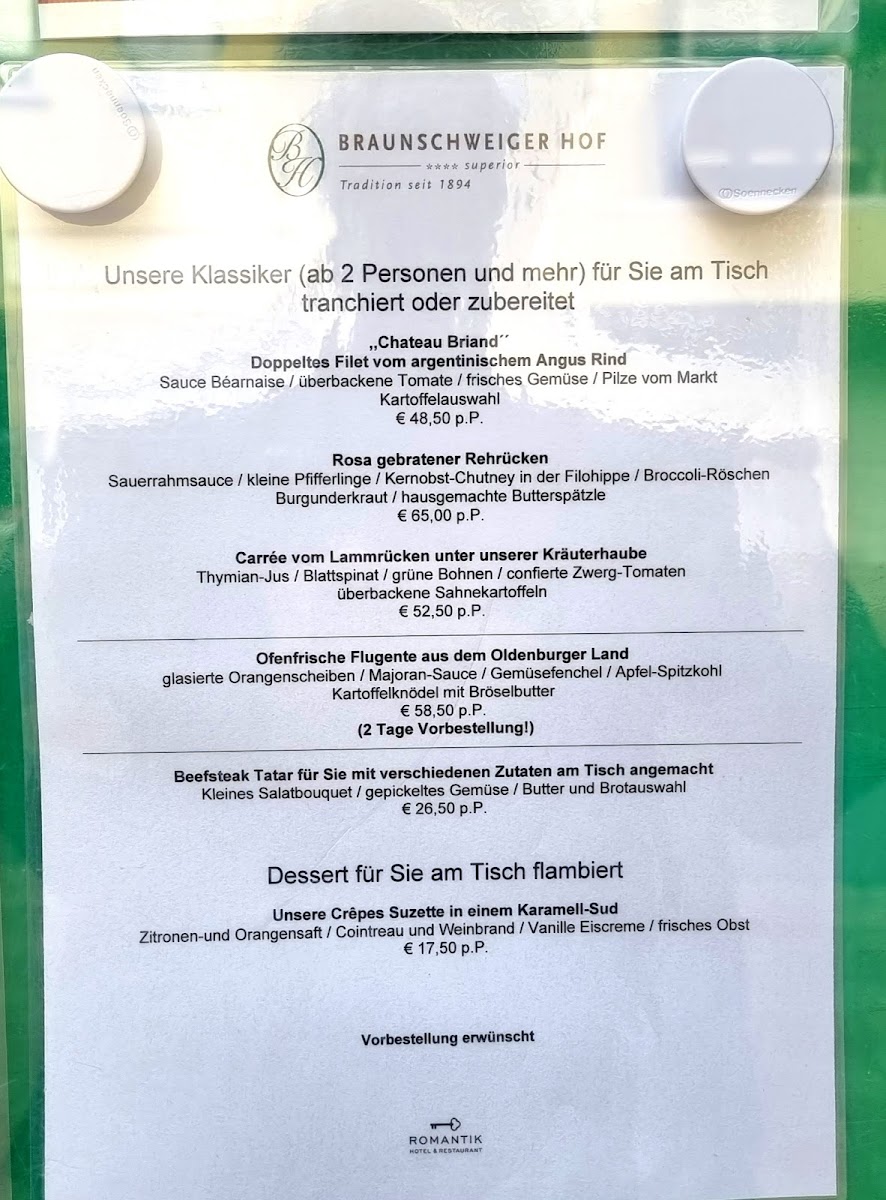 The menu at Restaurant Behnecke im Hotel Braunschweiger Hof offers a refined selection of dishes that blend traditional German flavors with a modern touch. Guests can expect a thoughtful range of options, from hearty steaks like Chateaubriand and Rindersteak to more delicate specialties such as Rindercarpaccio and Röllchen vom Edelfisch. These dishes invite leisurely lunches or elegant dinners, fitting seamlessly with the restaurant’s cozy yet sophisticated atmosphere.